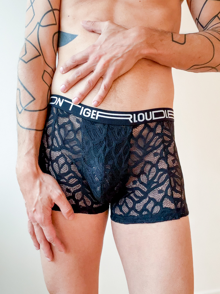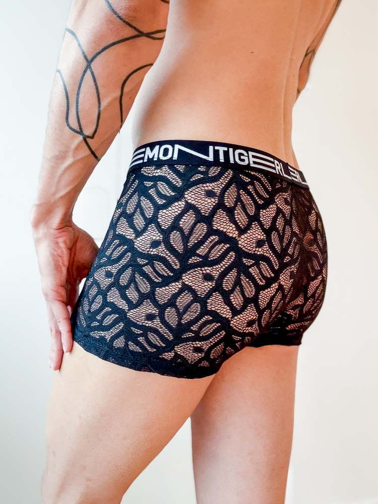 Enganliegende schwarze Boxershorts, komplett aus Spitze gefertigt. Von Hand mit Liebe hergestellt in der Schweiz, mit Stoffen und Spitze aus Restposten. Materialien: bi-elastische Spitze, Gummiband.