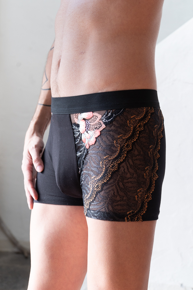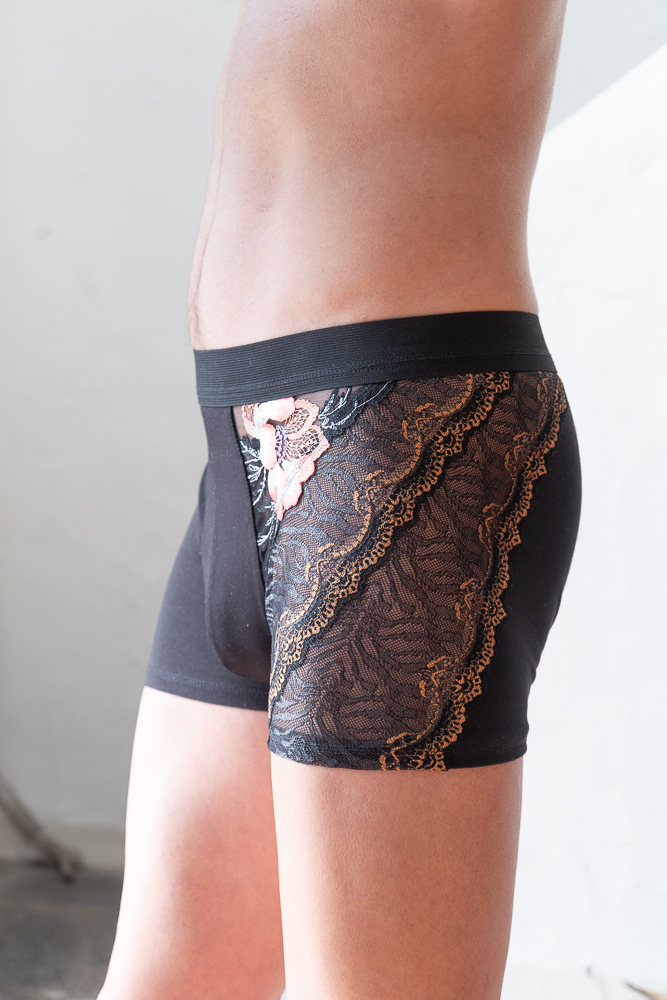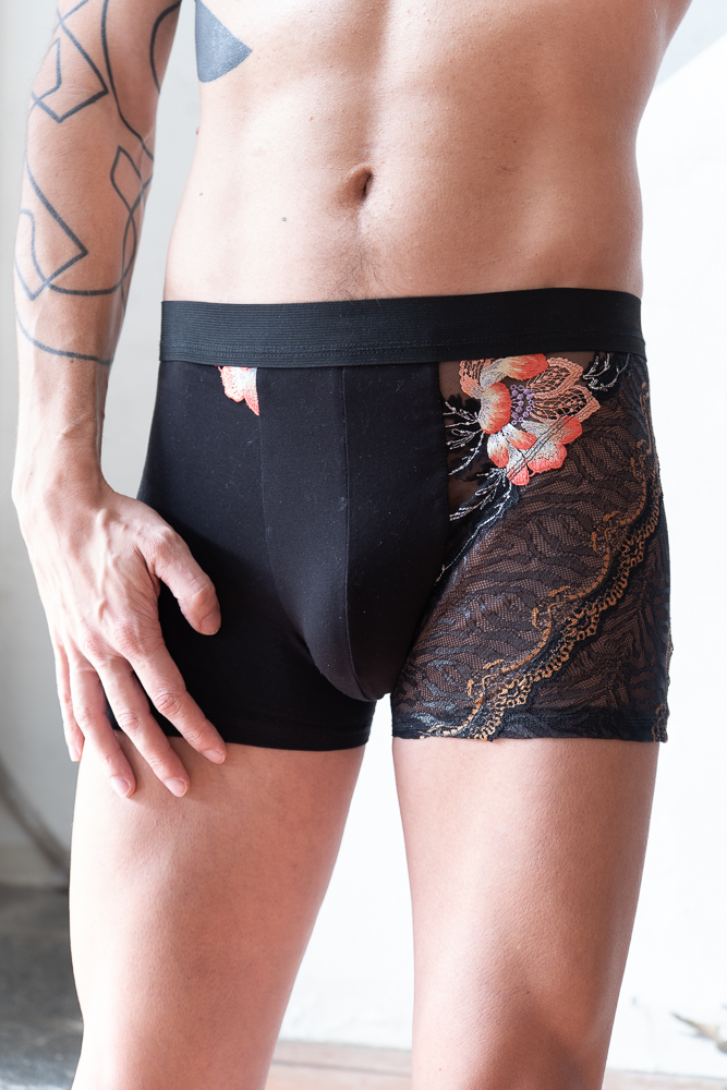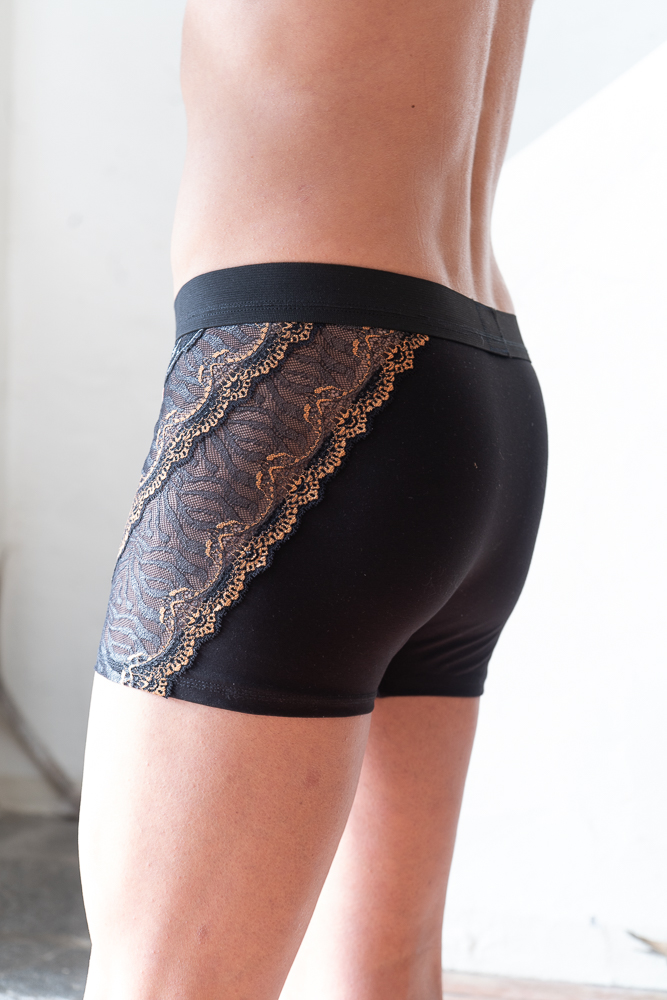 Enganliegende schwarze Boxershorts mit asymetrische Design. Von Hand mit Liebe hergestellt in der Schweiz mit Stoffen und Spitzen aus Restposten. Materialien: Circular Fabric Baumwolle 95%, Elastan 5%, elastische Spitzen und Stickereien.